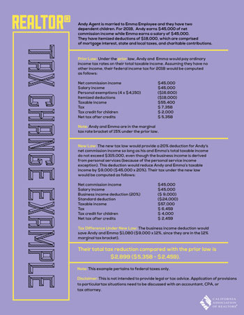 Since the Tax Cuts and Jobs Act was signed into law, many are concerned about the impact this tax reform plan will have on them. To help explain some of the major provisions affecting housing in California, C.A.R. has created various one-sheet handouts detailing the impact that this tax reform plan may have on first-time buyers, home sellers, homeowners, and REALTORS®. There also are sheets that provide examples of how a first-time buyer's taxes may change under this plan, as well as how a REALTOR®'s taxes could change. Check out these one-sheets and share them with your clients.